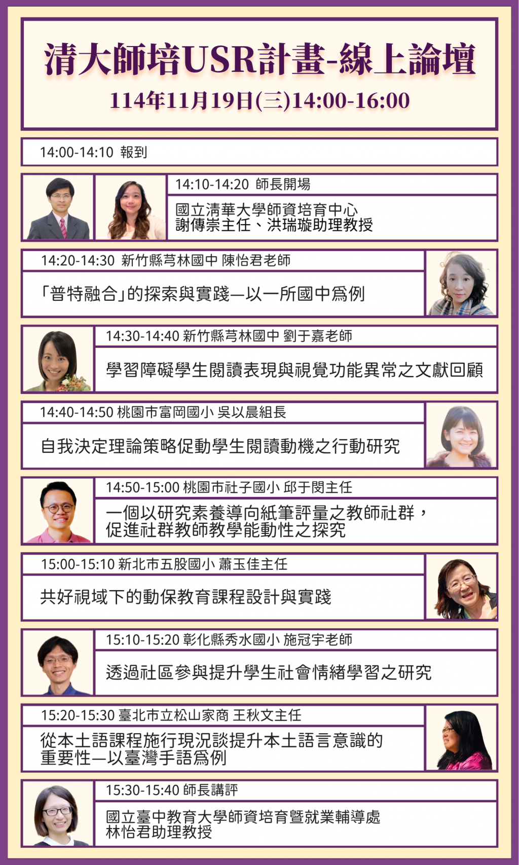 二、為推廣國立清華大學USR計畫之研究成果,爰辦理線上論壇,邀請參與計畫教師分享教學實踐與行動研究經驗,以促進跨域交流與專業對話。