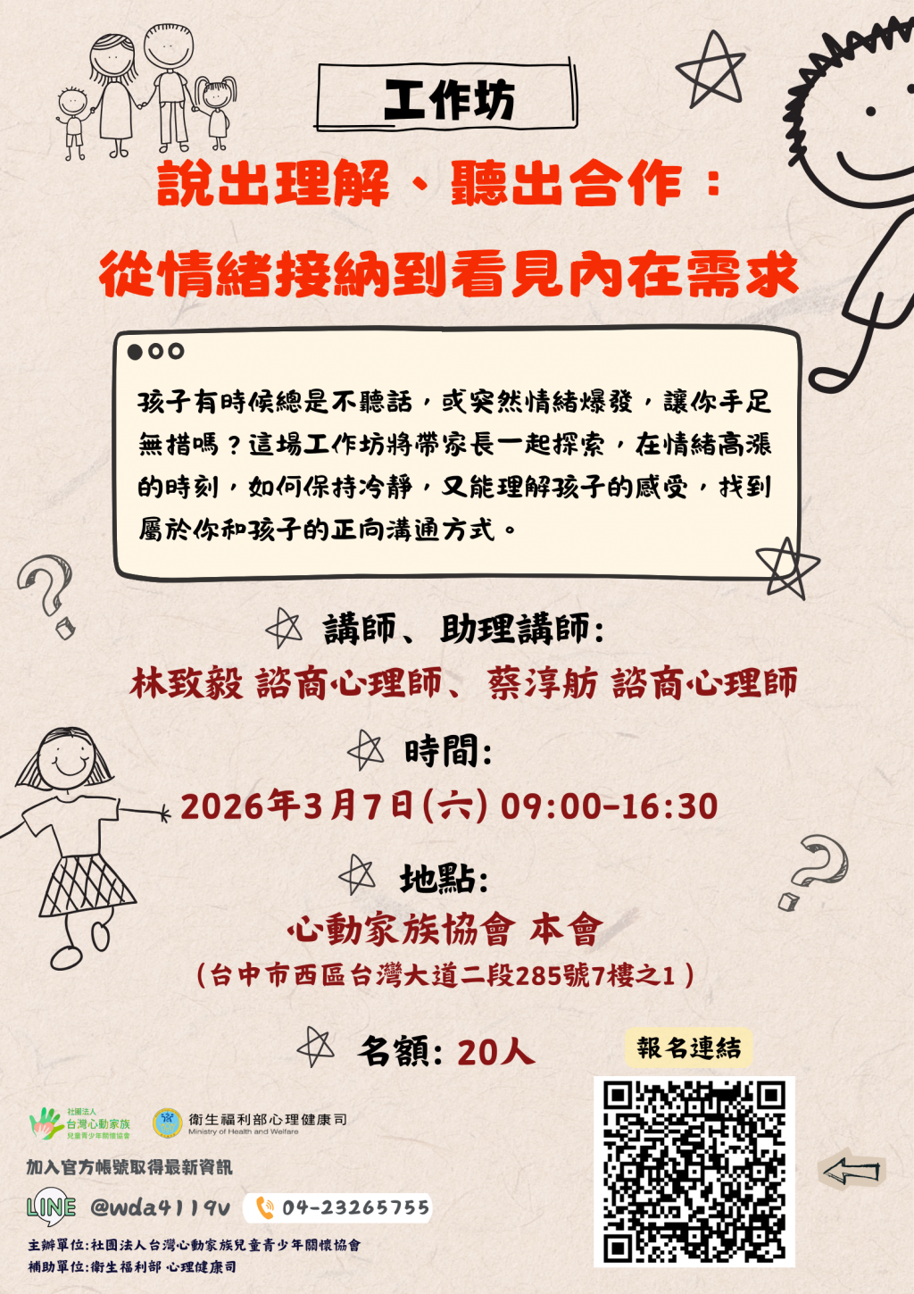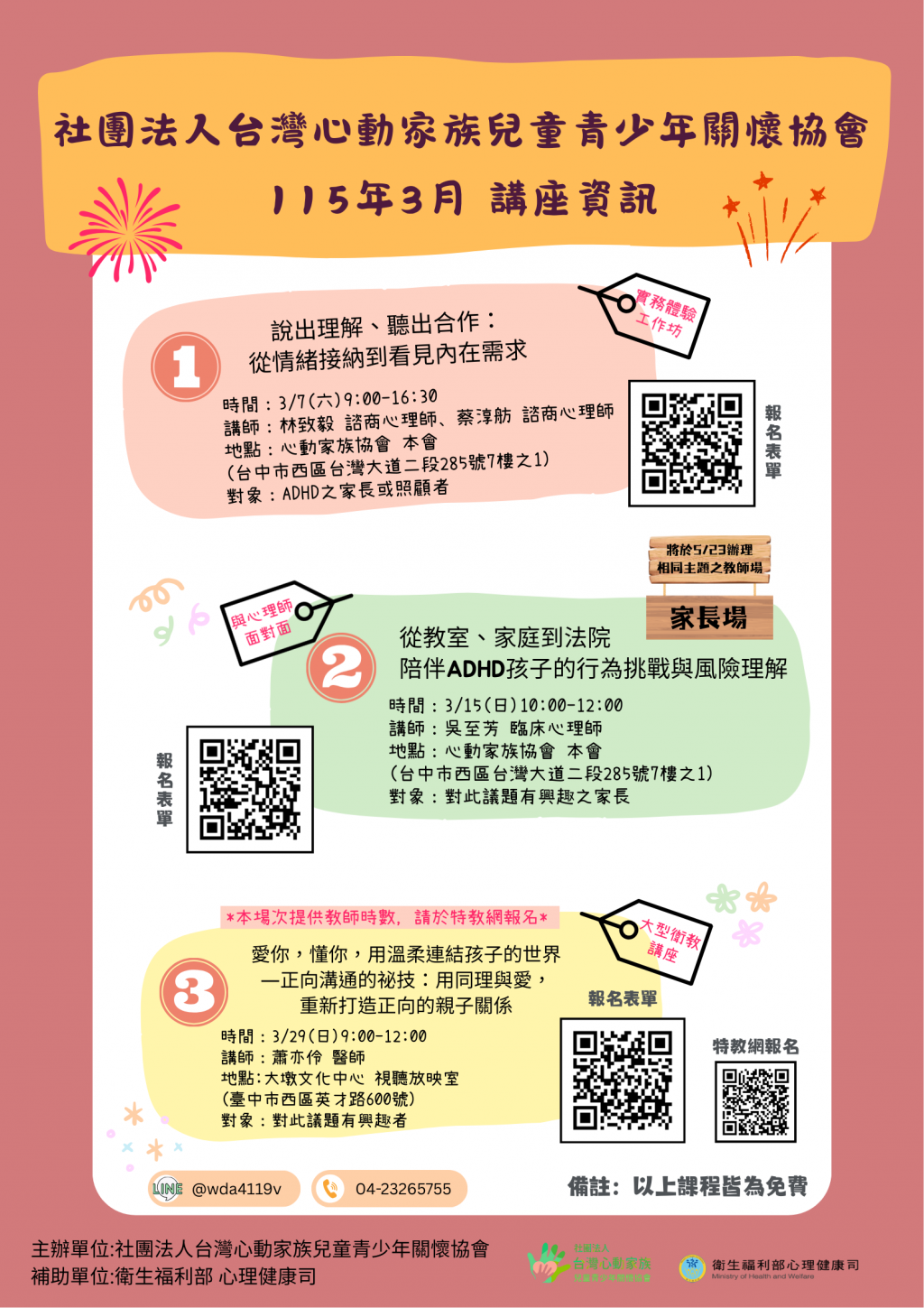 轉知社團法人台灣心動家族兒童青少年關懷協會辦理「115年03月 ADHD 相關主題講座及工作坊」,鼓勵符合需求之家長、照顧者、及教師等專業人員參與。