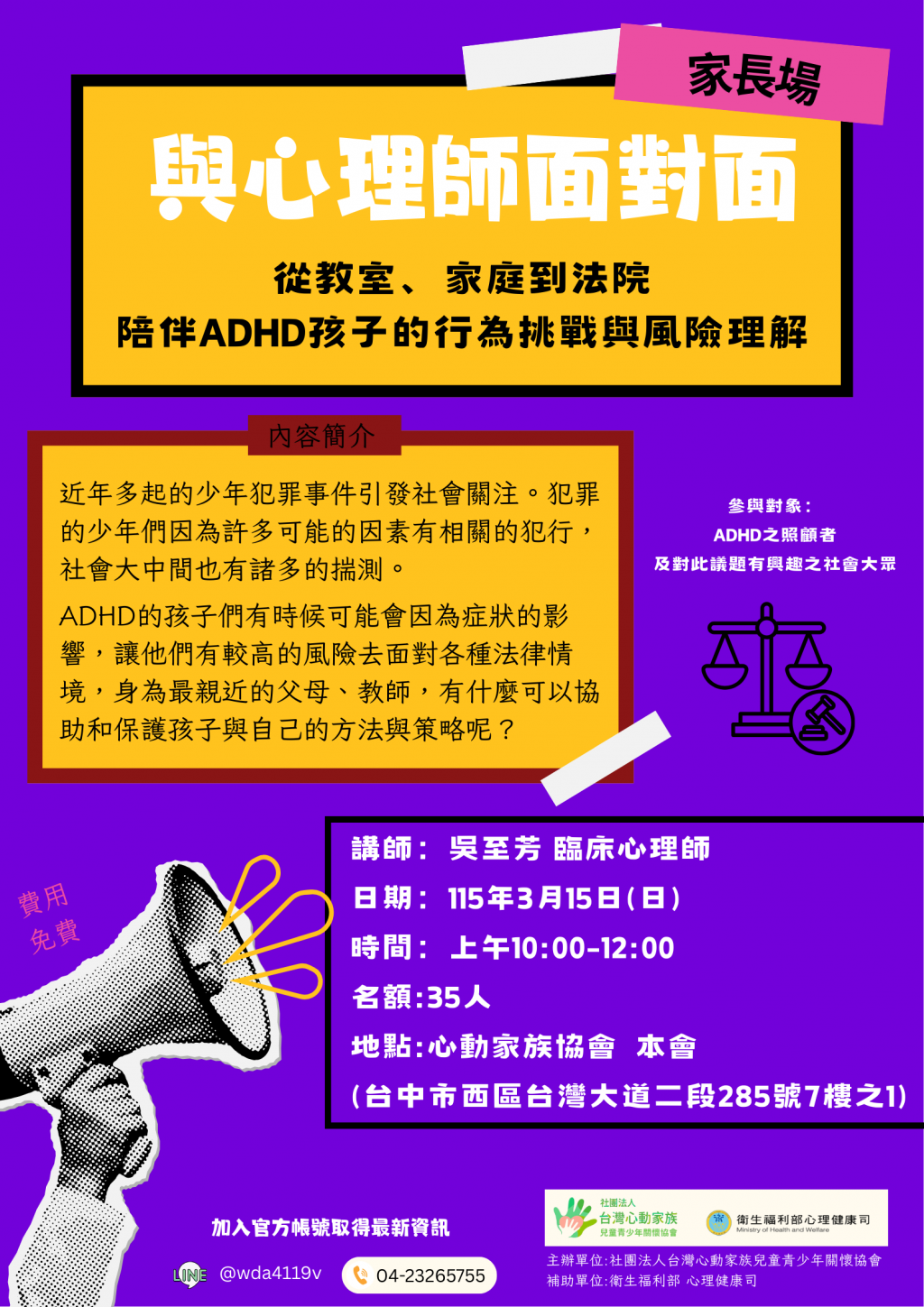 主題:從教室、家庭到法院-陪伴ADHD孩子的行為挑戰與風險理解 |
